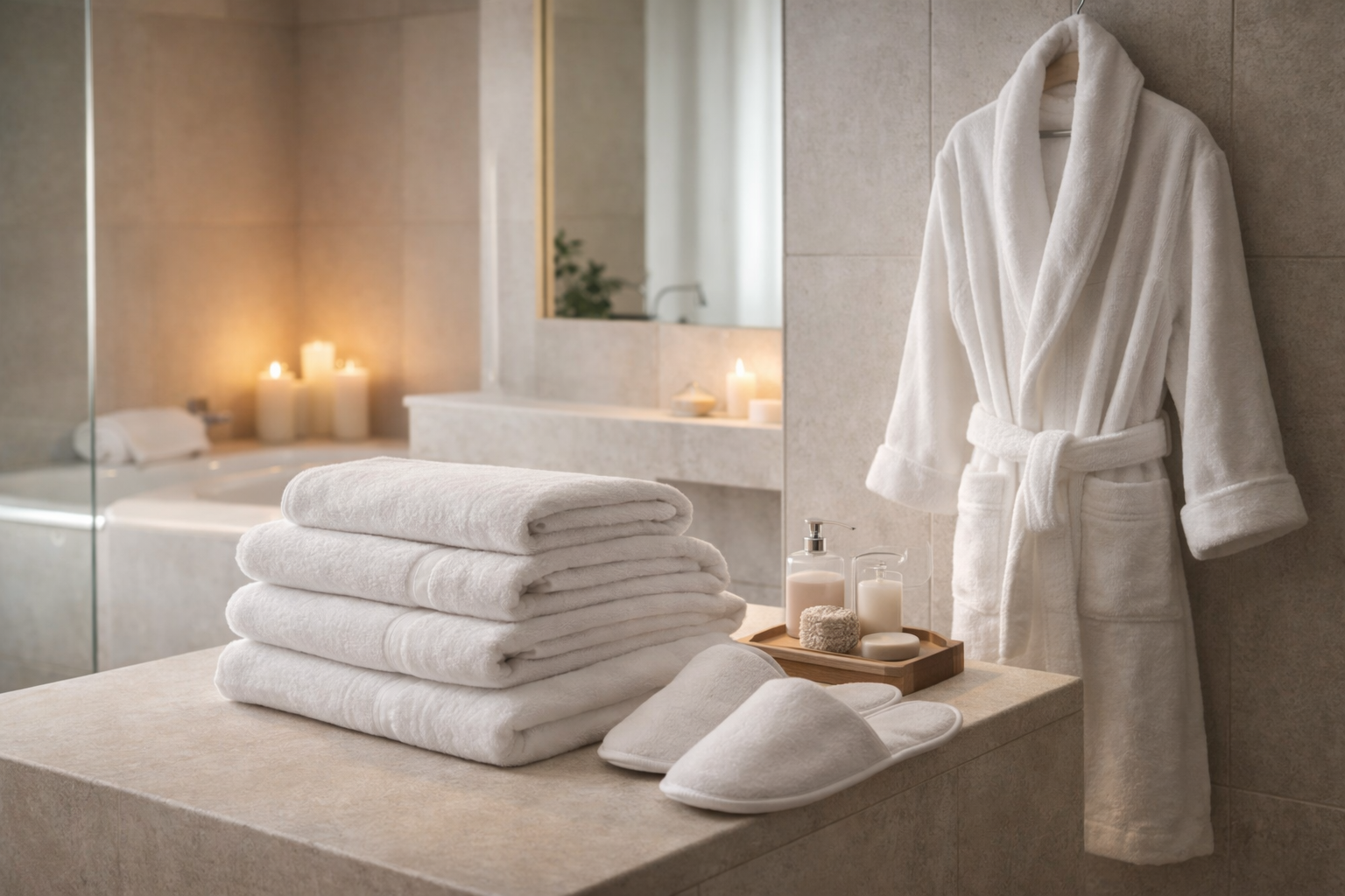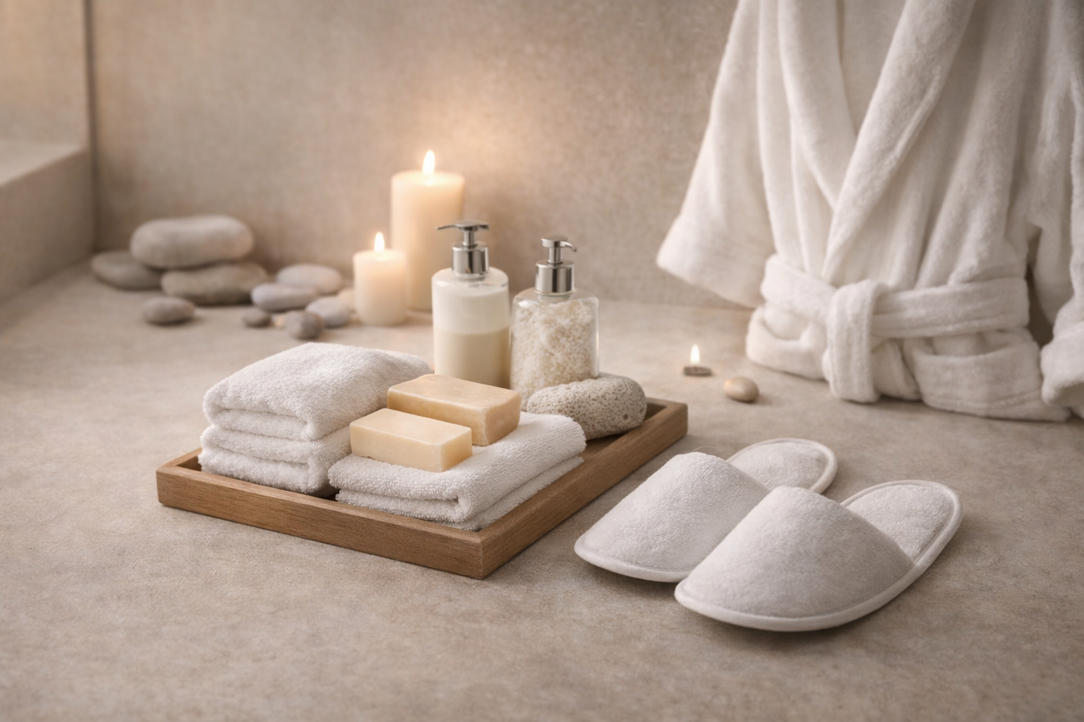 Spa-ready essentials—slippers, spa towels, headbands and accessory textiles designed for comfort and a refined guest experience.